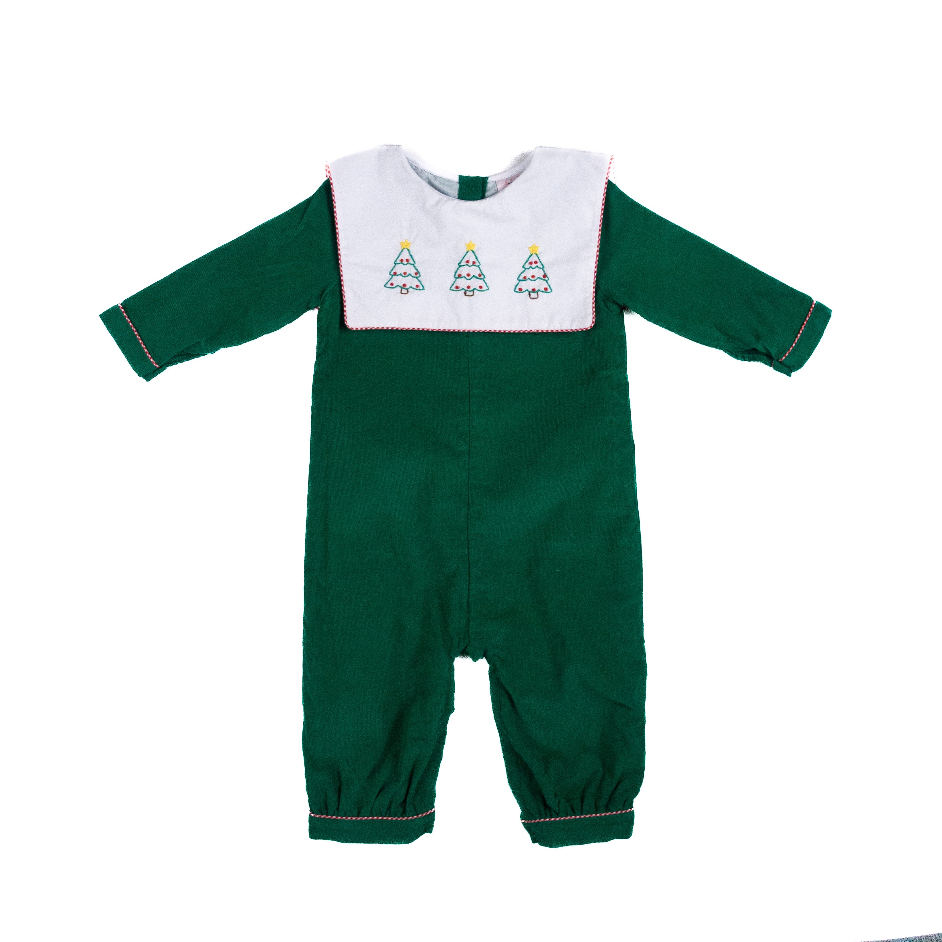 Classic and festive, this long-sleeve romper is made from soft green corduroy and features hand-embroidered Christmas trees across the chest. The button-back closure and elastic at the ankles provide comfort and ease, while the heirloom-quality makes it perfect for holiday gatherings and photos.