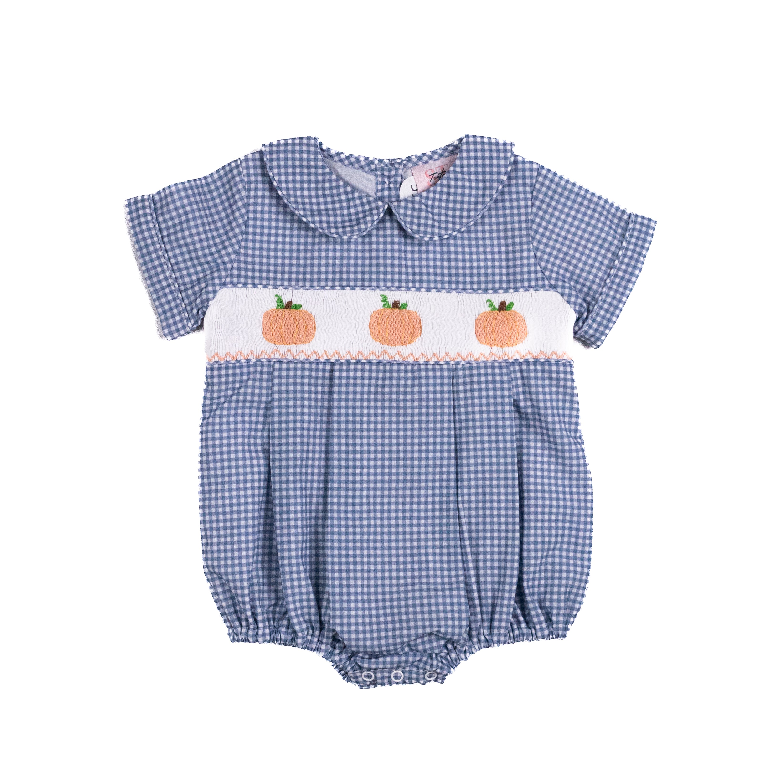 This bubble is both playful and refined. Made from lightweight woven gingham, it features hand-smocked pumpkins along the chest and a Peter Pan collar for a polished finish. The elasticized leg openings and snap closure provide comfort and convenience.