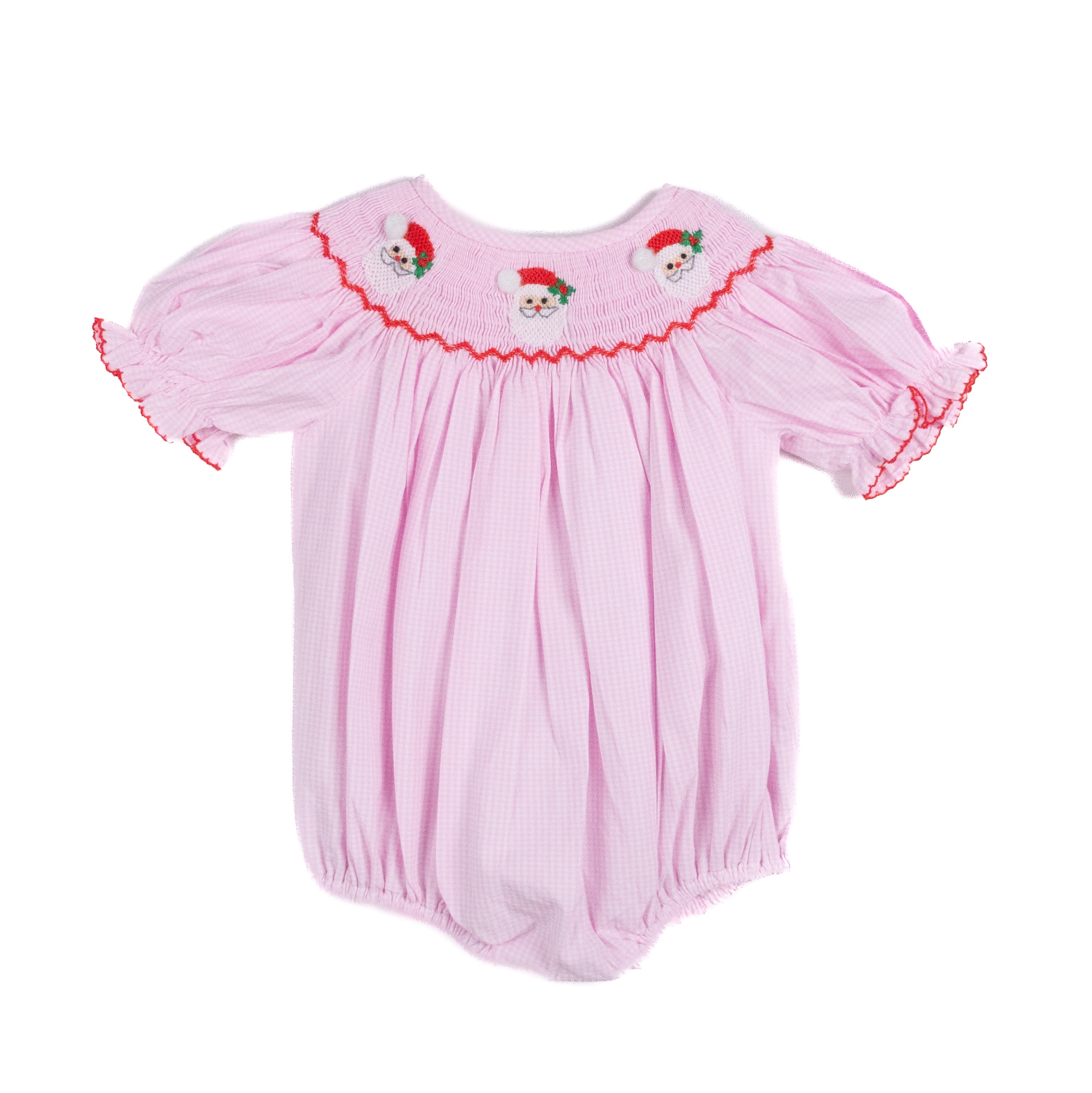 This classic pink woven bubble features delicate hand-smocking across the chest, adorned with jolly smocked Santa faces in festive hats. Puff sleeves trimmed with red stitching add a sweet touch, while elastic leg openings keep your little one comfortable all season long.