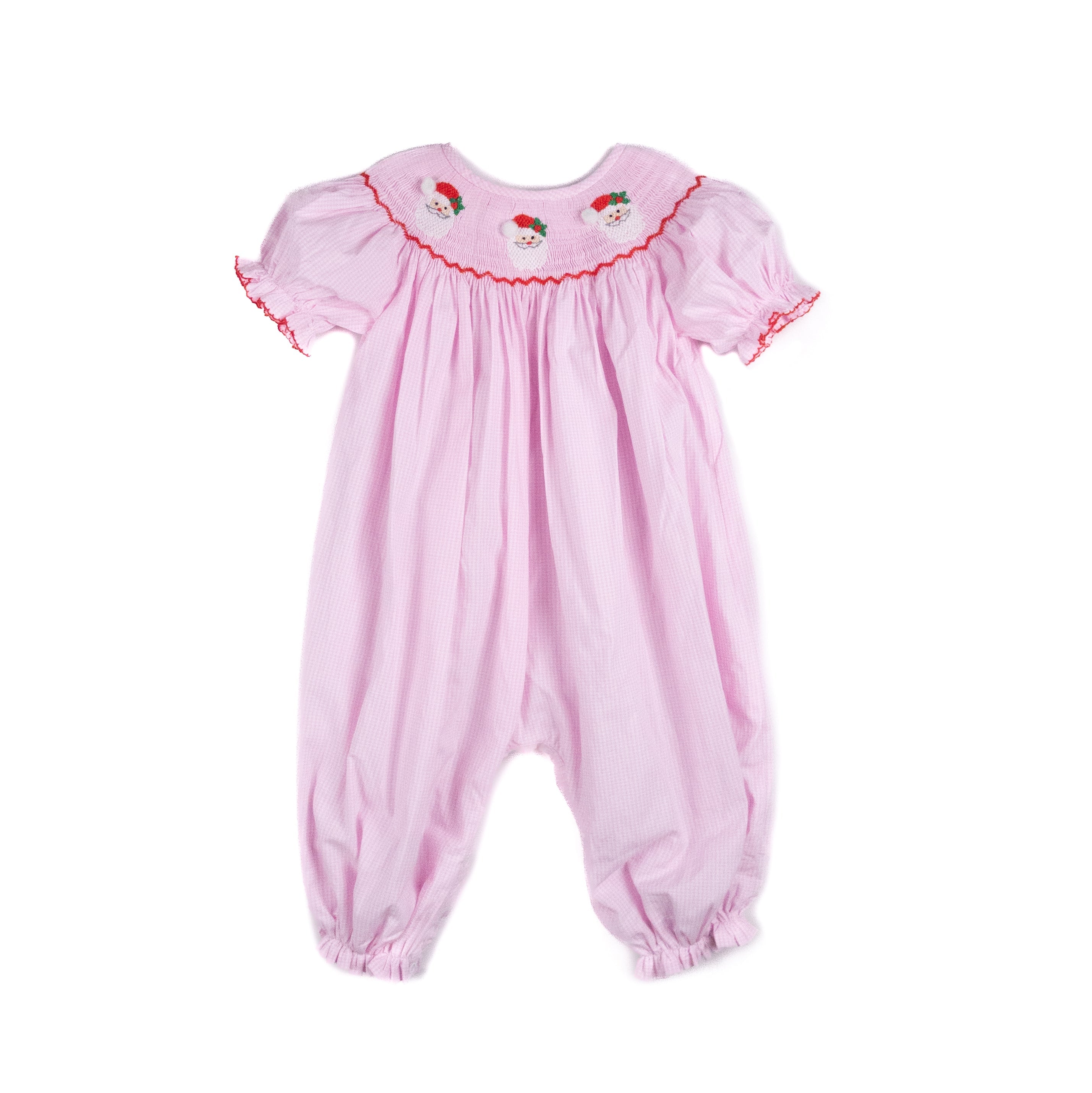 A timeless holiday outfit, this light pink gingham woven romper is hand-smocked with cheerful Santas.