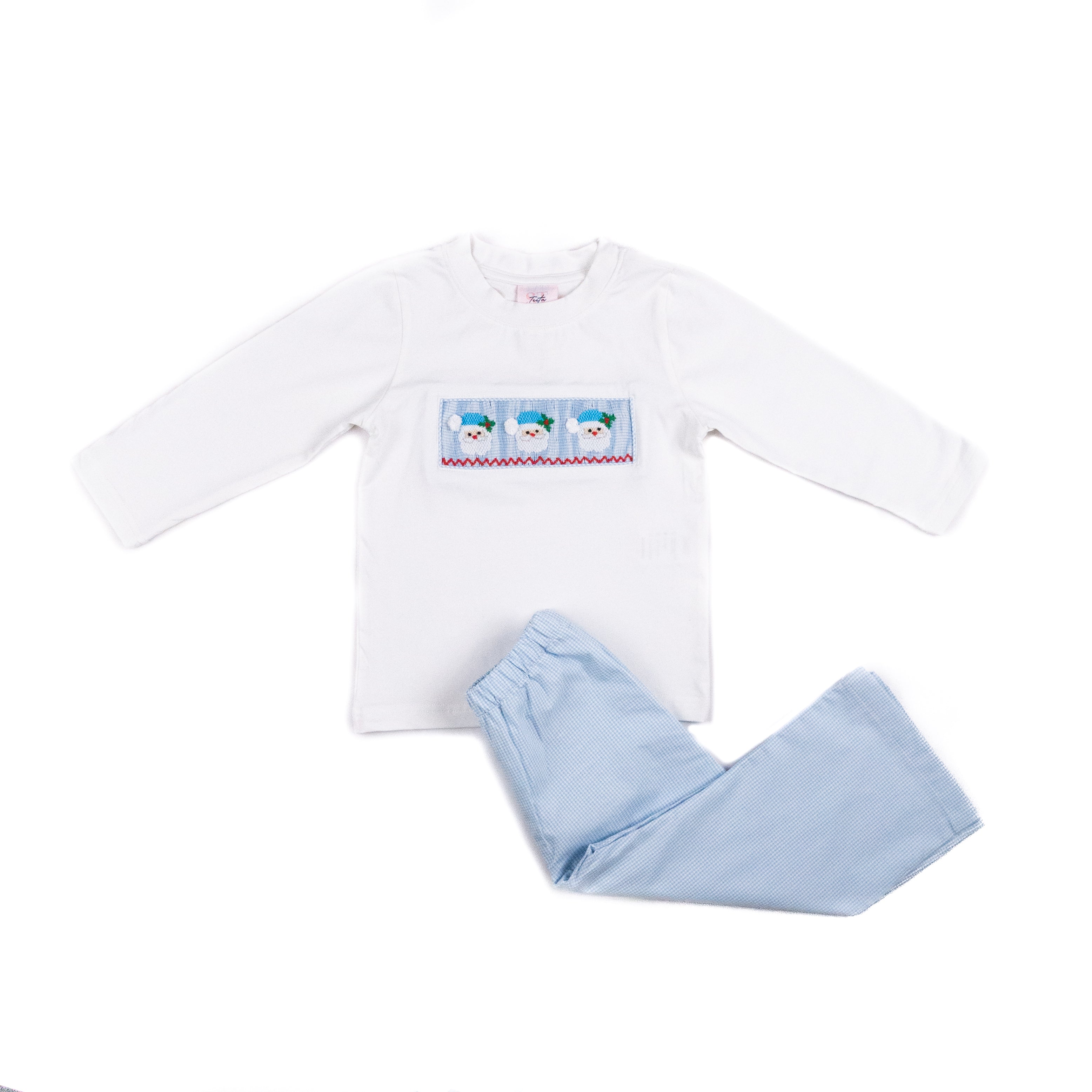 Perfect for winter fun, this two-piece set features a soft white knit top with a hand-smocked Santa panel, paired with coordinating light blue gingham woven pants. A festive yet comfortable outfit for boys all season long.