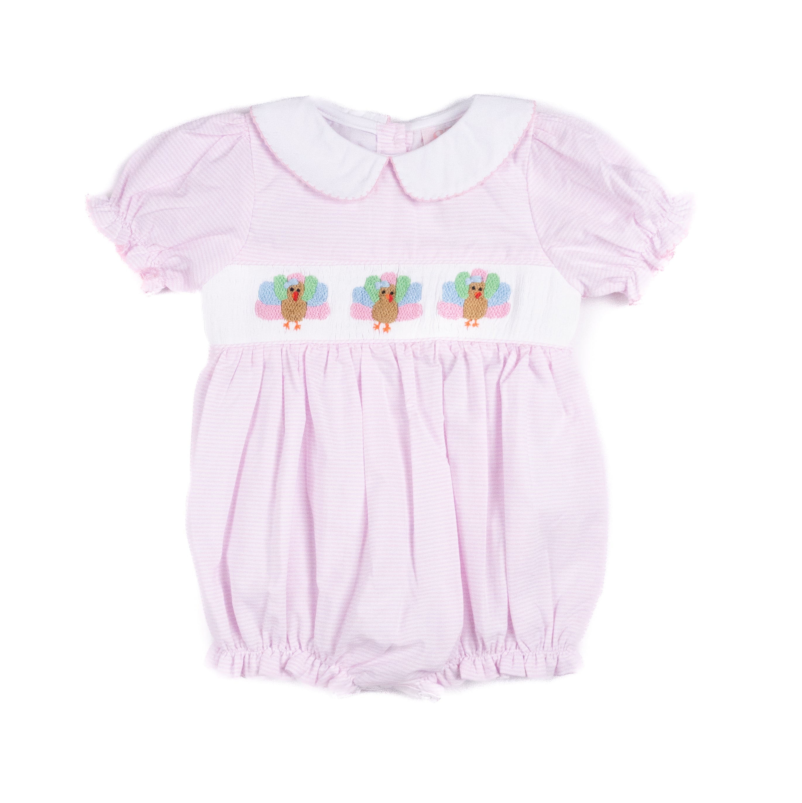 Sweet and festive, this pink striped bubble features hand-smocked turkeys across the chest, making it perfect for Thanksgiving celebrations. Designed with a classic Peter Pan collar, puff sleeves, and soft pleats for a timeless silhouette. The smocking is done entirely by hand, adding a touch of tradition and charm to this holiday-ready style.