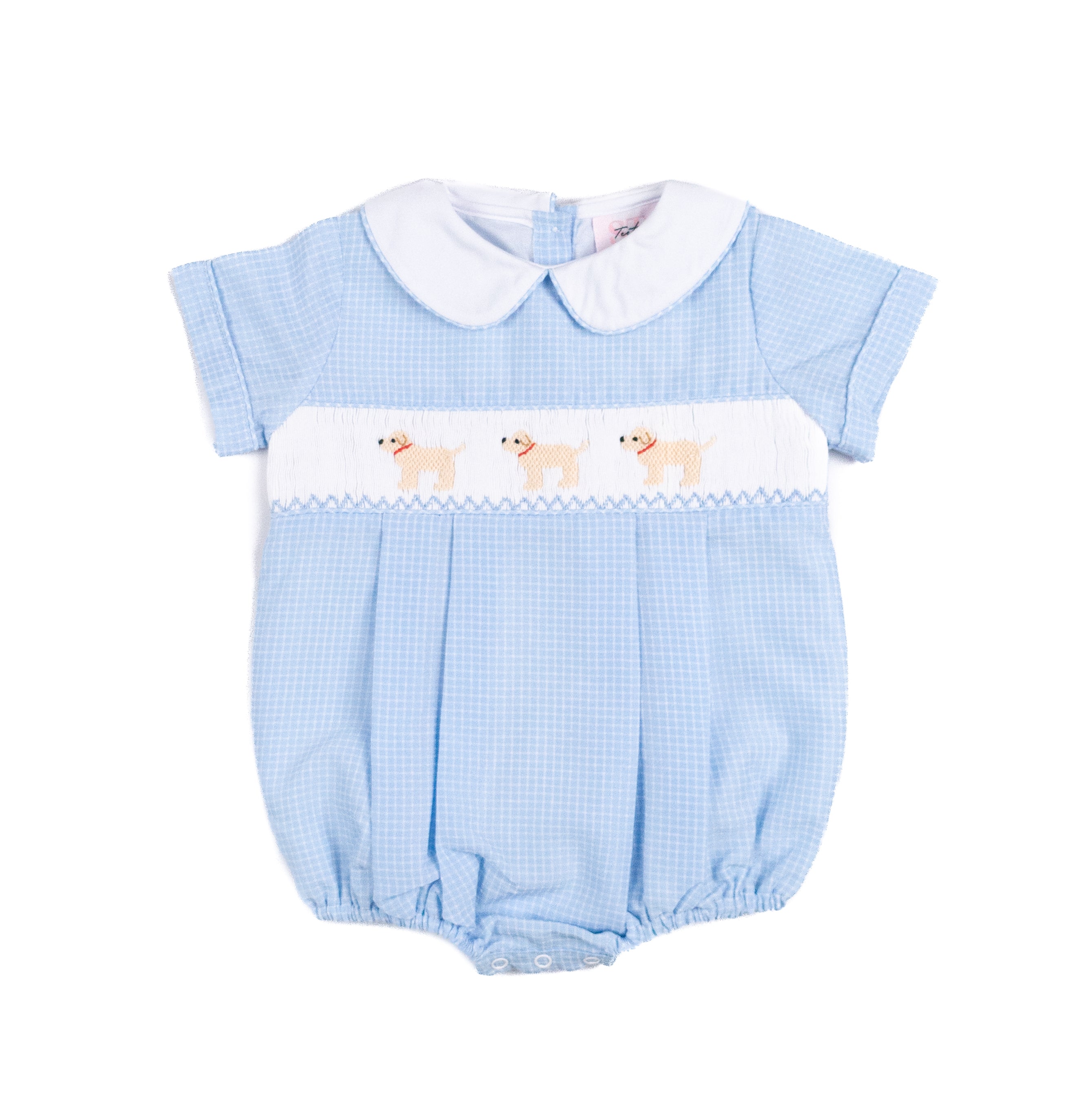 This sweet blue gingham bubble features hand-smocked puppies across the chest, each lovingly detailed for a timeless look. Made from soft woven fabric with a crisp white Peter Pan collar, this outfit is perfect for everyday play or special occasions. Snap closures at the bottom ensure easy changing.