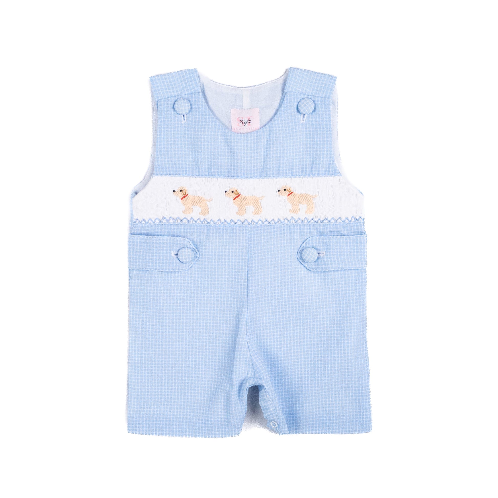 This classic jon jon is crafted in light blue gingham woven fabric and detailed with hand-smocked puppies across the chest. Button tabs at the sides and snaps along the legs make dressing easy, while the timeless design makes it a versatile wardrobe staple.