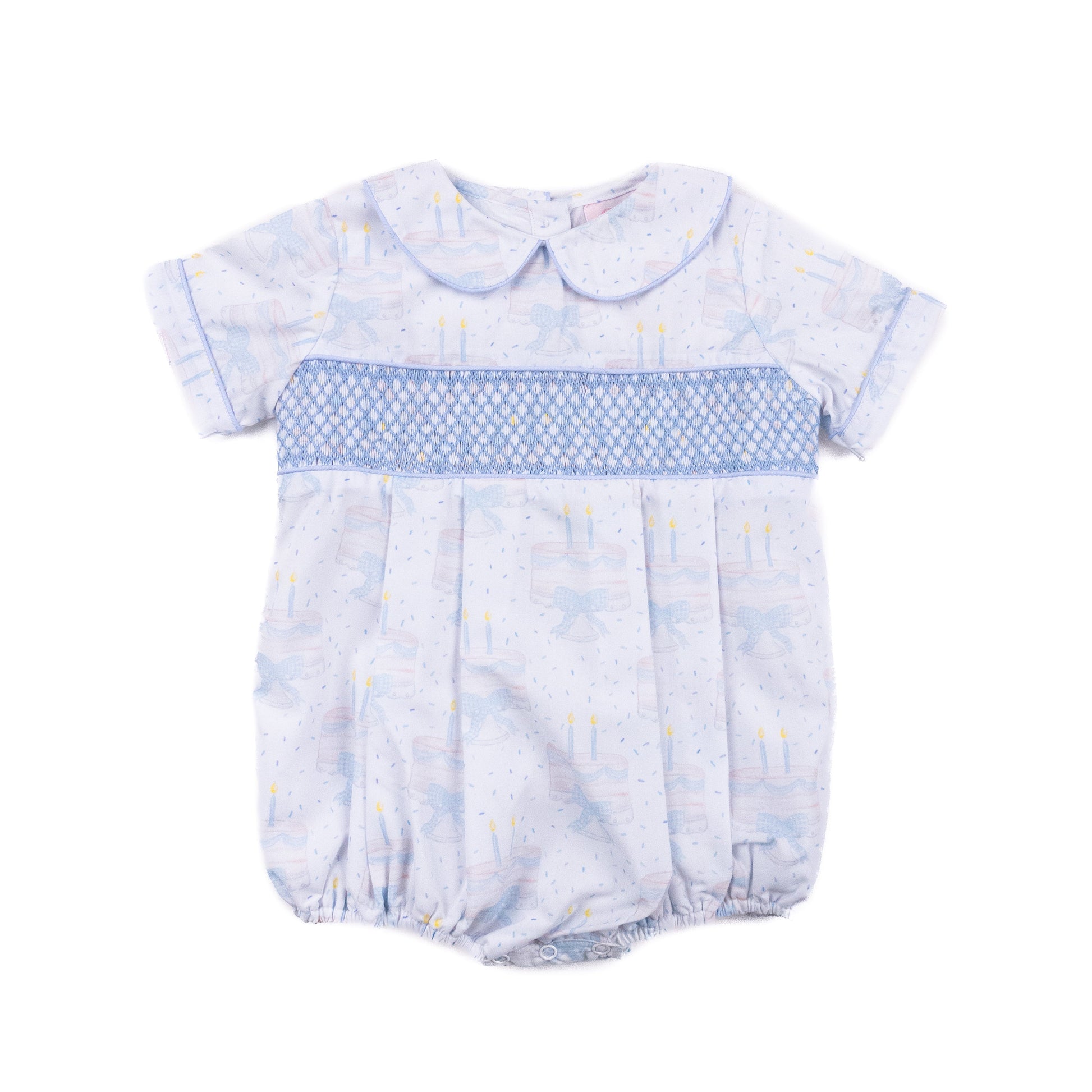 A timeless option for birthday celebrations, this boy bubble is made from woven cotton blend fabric in the birthday cake print. The front panel is hand-smocked in shades of blue, with a peter pan collar for a polished finish. Snaps at the bottom make for easy dressing and changes.