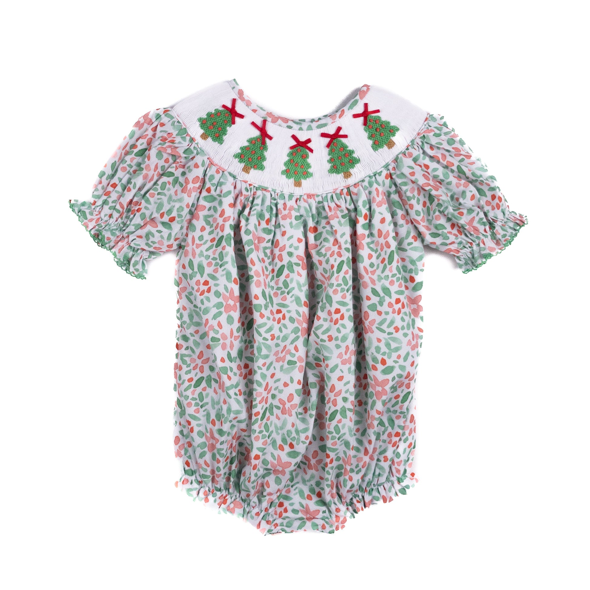 Adorable and festive, this hand-smocked bubble romper is made from a breathable woven cotton blend, designed with comfort and charm in mind. The playful holly print pairs perfectly with the hand-embroidered Christmas tree smocking across the white neckline, accented with tiny red bows. Puff sleeves with elastic hems and gathered leg openings create a classic bubble shape that keeps little ones cozy while allowing freedom to move. Ideal for holiday celebrations, this romper is a keepsake piece to treasure.