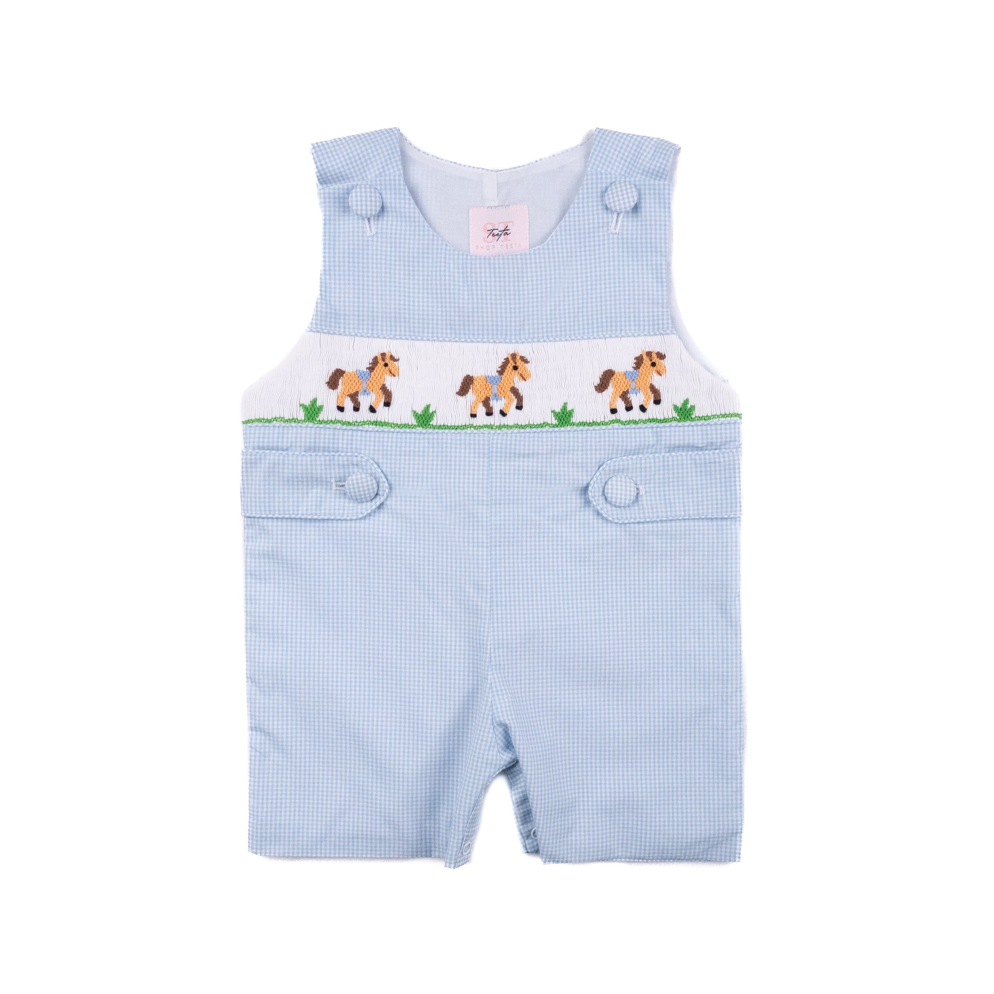 A classic shortall in light blue gingham, featuring hand-smocked horses across the chest. Button details at the shoulders and sides give it a polished, traditional finish.