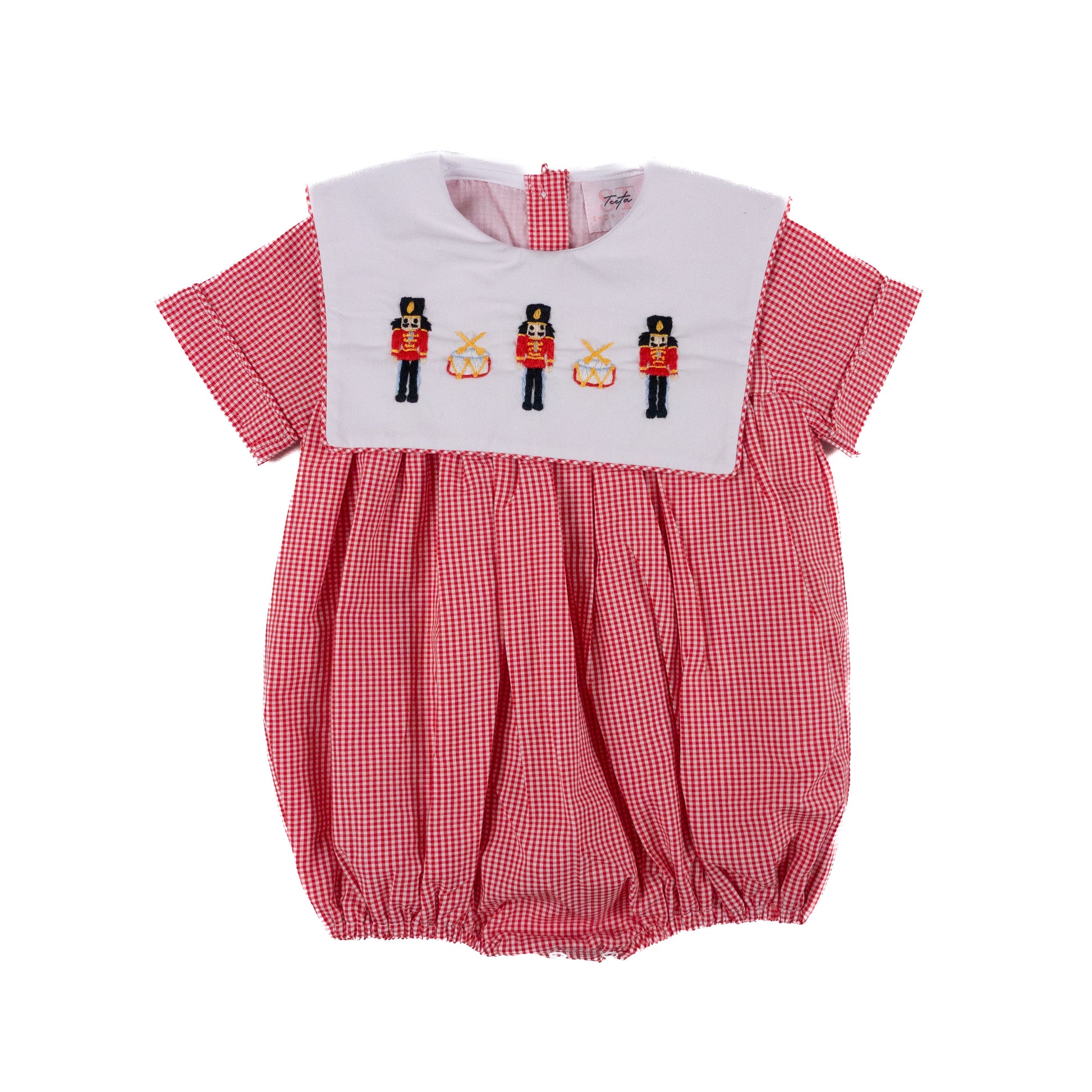This cheerful bubble is made from woven cotton gingham with hand-embroidered toy soldiers and drums across the bib. The elastic leg openings and button-back closure make it as practical as it is charming—ideal for holiday festivities.